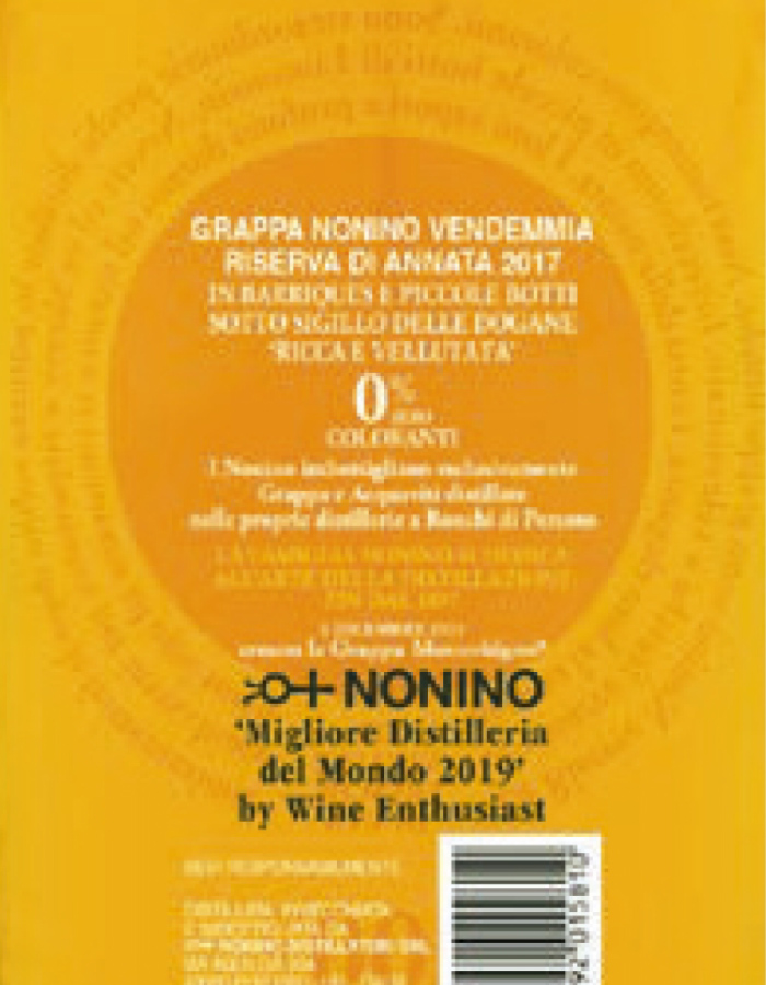 CI BATTIAMO dagli anni ‘70 per l’obbligo di una etichetta della Grappa che riporti una chiara informazione a tutela del consumatore e per consentire scelte consapevoli. Per garantire i nostri estimatori dichiariamo sull’etichetta delle nostre acqueviti le diciture che hanno valore legale: per tutte le Grappe ed Acquaviti “100% distillata con metodo artigianale” e per tutte le Grappe Acquaviti Invecchiate e Riserva “0% coloranti” che significa che non viene aggiunto colorante o caramello nel prodotto e che il colore è determinato esclusivamente dalle cessioni del legno delle barriques.